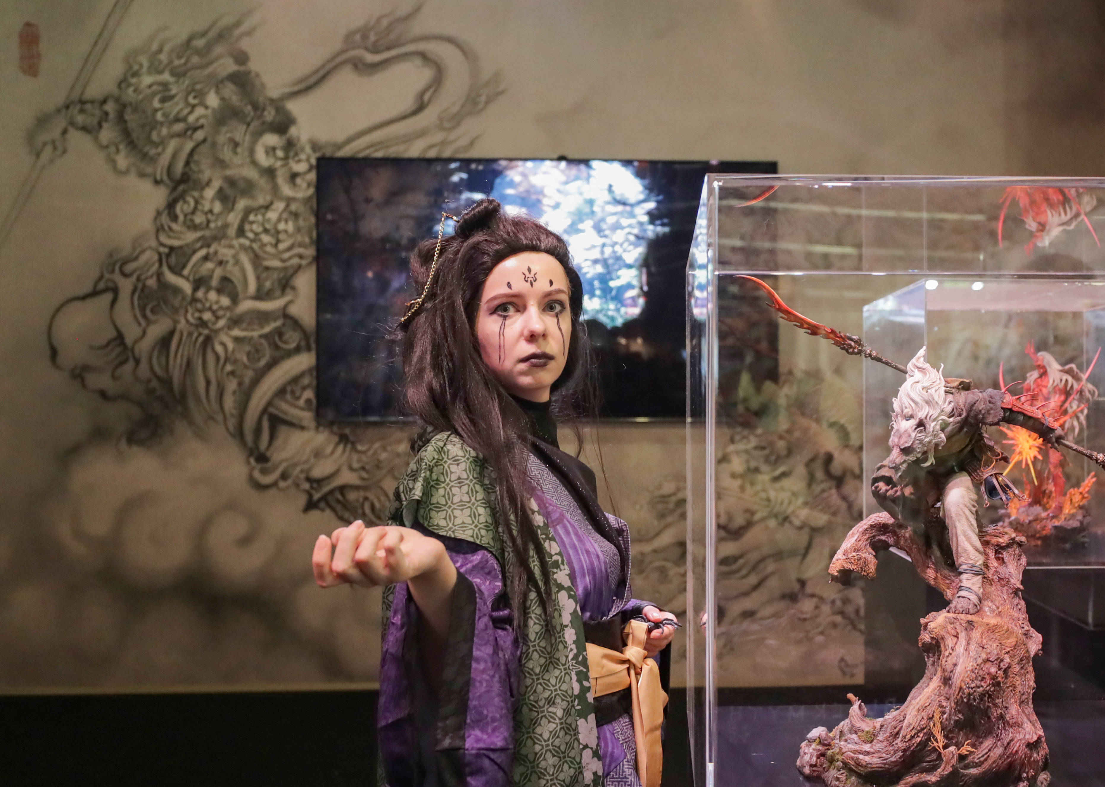 8月20日,在德国科隆,一名《黑神话:悟空》游戏角色扮演者在游戏科学展台与模型合影。新华社记者张帆摄《黑神话:钟馗》约2分钟的视频引起全场欢呼。主持人称其为“说晚安前的最后一大惊喜”。
